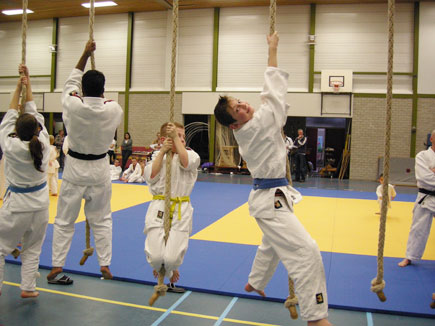 Een week of 2 geleden is Jim voor het eerst weer voorzichtig begonnen met judo (nadat hij z’n pols gebroken heeft). In het begin was het nog wel eng, maar dat gevoel begint nu langzaam te slijten. Vandaag was de eerste test: de jaarlijkse Judomarathon van zijn (eigen) sportschool Slingerland. Om 5 uur uit bed, om 6 uur op de mat en om 18.00 uur er weer af. 12 uur lang judo en spelletjes met zo’n 120 judoka’s, waaronder de voltallige selectie (zie foto boven).