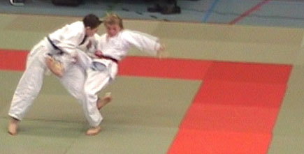 Dit werd een van de meest bizarre finales die we gezien hebben. Matthijs (ook van Slingerland) kreeg eerst een ippon van de scheidsrechter. Die werd afgezwaaid door de hoekscheidsrechters, en verlaagd tot een wasa-ari. Ook erg mooi, alleen ging de score bij de ander op het bord, waardoor Matthijs verloor. De zaal veranderde in een heksenketel, maar de scheidsrechters wilden van geen wijken weten, en lieten doorgaan. Jim won hierna gelukkig met een ippon door houdgreep, maar als team kwamen ze toch nog punten te kort en zouden ze daarna om 2 en 3 moeten gaan strijden. De zaal was nog steeds niet rustig, en de scheidsrechters beslisten uiteindelijk om de partij van Matthijs maar over te laten judo-en. Onterecht, maar beter nog een kans dan verliezen. Het werd een zinderend potje, maar gelukkig won hij weer en bleef Slingerland met het -12 team de kampioen van Zuid Holland!