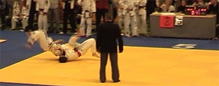 Vierde tegenstander was ook weer een pittige. Jim kwam vrij snel een koka achter, maar probeerde ook hier weer een sutemi (offerworp), en met succes. Hij scoorde een wasa-ari, won de partij en belandde zo op fantastische wijze in de finale.