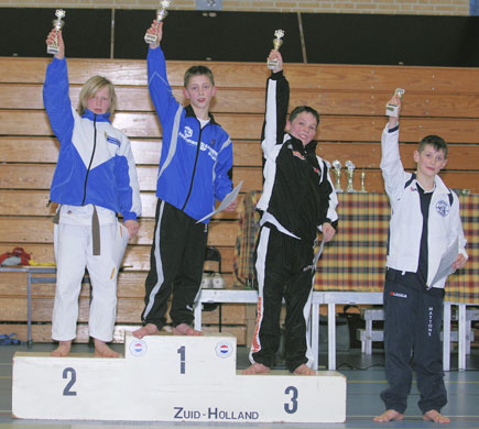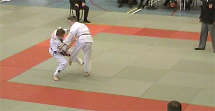 Op naar Den Haag dus. Daar aangekomen bleek inderdaad de hele Zuid-Hollandse judotop aanwezig. Jim begon met een vrijloot. Zijn eerste echte wedstrijd was tegen de 2 jaar oudere Mike van der Windt van ‘Judo Gouweleeuw’ uit Delft. Al vrij snel kwam Jim een Wasa-ari voor door een Ko-Uchi-Gari (kleine binnenwaartse beenveeg). Jim stond als een huis, en later in de partij wist hij met dezelfde worp, dezelfde score te maken. Ippon voor Jim dus.