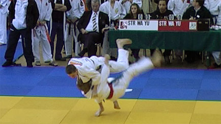 Eindelijk begint dan zijn eerste partij. Hij treft een onbekende judoka, begint een beetje met hem te sleuren en na 10 seconden werpt Jim hem in ippon (Uchi Mata). Pfff, de kop is eraf.