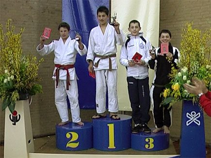 Zevende pot was weer tegen Wessel Hermans (van die mooie overname). Wessel was duidelijk moe. Wel een sterke judoka, maar qua judo leek het niet veel meer. Hij kreeg tot 2 maal toe een straf en Jim stond dus een yuko voor. Als hij deze vast zou weten te houden mocht hij hierna de finale gaan judo-en. Het was dus rete-spannend. Jim zijn mat had (als enige van de zeven) echter geen klok. Erg zwak voor een toernooi van dit kaliber. Het einde naderde maar hoeveel seconden precies wisten we dus niet. Jim had makkelijk met passief judo de partij kunnen eindigen (hij had zelfs nog een straf kunnen krijgen voor de winst), maar hij bleef aanvallen. Mooi judo gaat bij Jim blijkbaar voor de winst. Zo liep hij in de laatste seconden van de wedstrijd op een voetveeg van Wessel die zo de partij nog wist te winnen ook. Ongelooflijk maar waar. Jim baalde verschrikkelijk en zal een volgende keer waarschijnlijk toch wel voor iets minder mooi judo in de laatste seconden gaan, maar dan wel voor winst. Maar, derde op een toernooi als dit is natuurlijk een prestatie van groot formaat. Wel hebben we onszelf beloofd dat we hier volgend jaar niet meer naar toe hoeven te gaan. De prijsuitreiking was namelijk pas om 8 (!) uur afgelopen. Gelukkig waren we in 20 minuten thuis en hoefden we niet meer naar Limburg of Armenië te rijden.