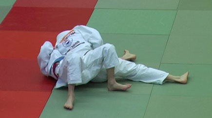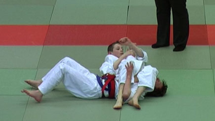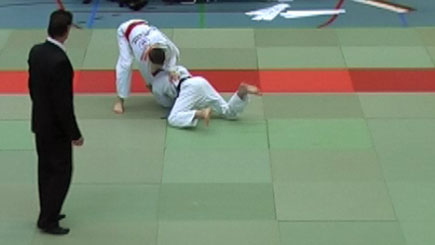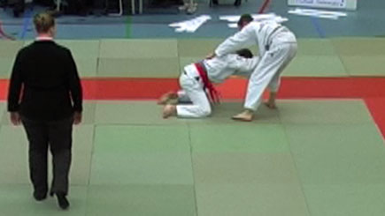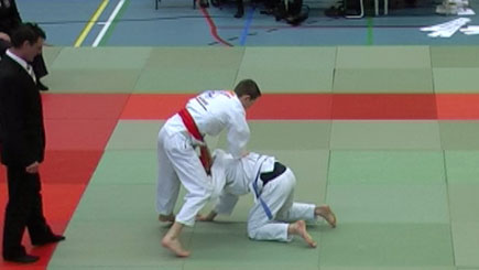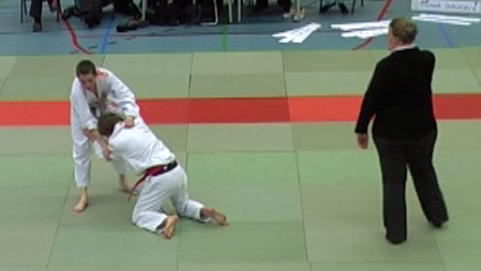 Vierde partij ging tegen Tom vd Kolk van ‘Arashi’ uit Alphen aan den Rijn. Jim scoorde eerst een yuko en daarna kwam Tom bij Jim in een houdgreep terecht waar hij niet meer uit zou komen. Ippon voor Jim.
