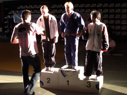 Deze andere judoka was Frank de Wit, de nummer 2 van Nederland, van Ben Rietdijk Sport uit Velserbroek. Het ging er fel aan toe en de partij speelde zich voornamelijk af op de grond (ne-waza). Jim kreeg geen grip op Frank, maar Frank kreeg ook geen grip op Jim. Ze rolden en probeerden maar zonder resultaat. Tot zo’n 10 seconden voor het eind toen Jim met het weer naar de grond gaan op z’n zij terecht kwam en Frank zodoende wasa-ari scoorde. Yuko had ik ook geloofd, maar hoe dan ook was het voor Frank genoeg om te winnen, en zo werd Jim hier (overigens zonder coach, die verhinderd was) heel knap TWEEDE!