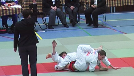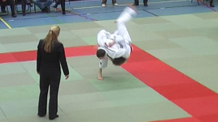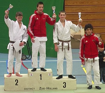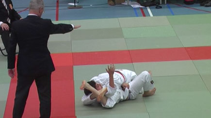Eerste wedstrijd won hij met een vrijloot. Tweede partij was tegen Robin v.d. Nieuwendijk van Den Edel uit Waddinxveen. Jim heeft hier geen 4 minuten nodig want al snel beslist hij met een uchi-mata de partij. De kop is er af.