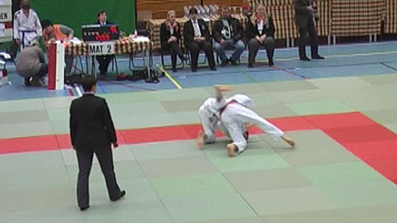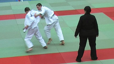 Jim (met 1 voet op de grond) maakt uchi-mata